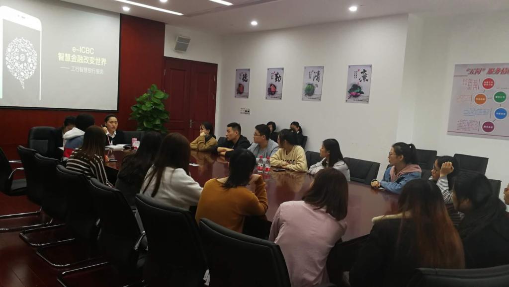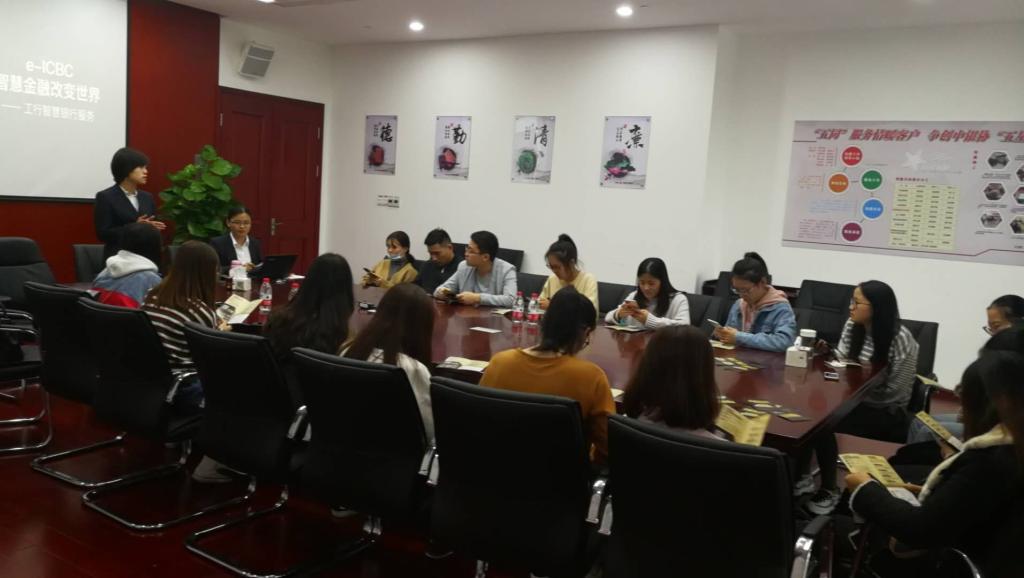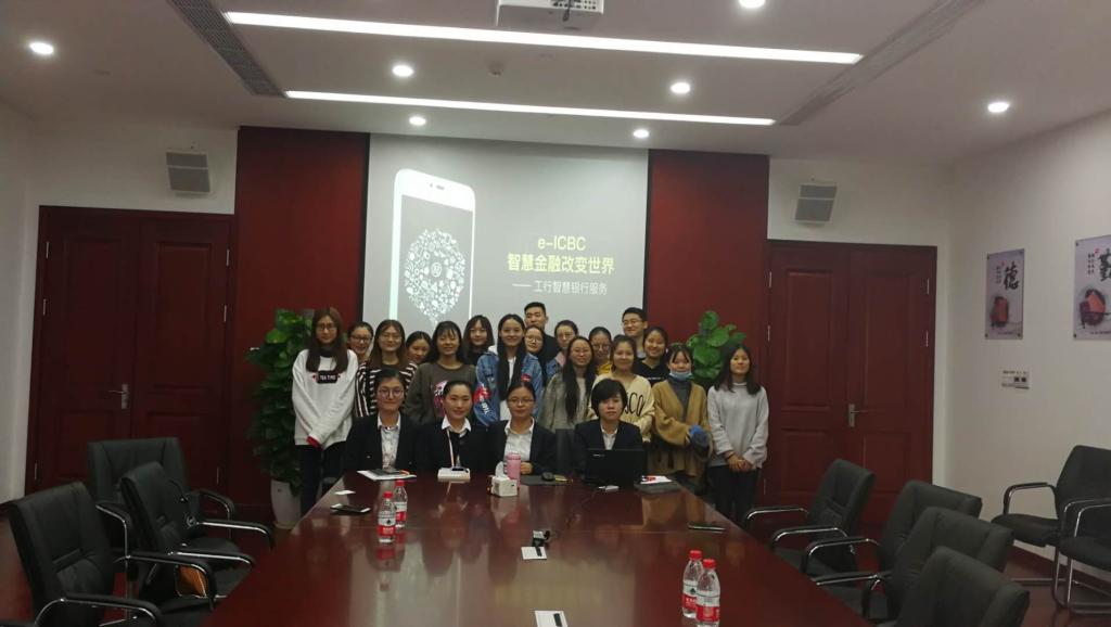 商英系A15商英班全体同学赴中国工商银行舟山分行参观并聆听了由国际结算部刘经理和金经理、电子银行部的郑经理和俞经理为同学们带来的国际金融知识拓展与实际业务操作中的案例与经验分享。