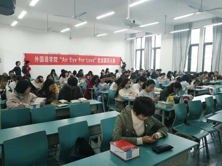 11月11日下午,外语文化月"An Eye For Love "歌曲翻译大赛在长峙校区公共教学楼举办。比赛以小组合作翻译试卷的形式进行,考生们自行组队,两人或三人一组参加了本次比赛。学习部部长熊蔚和干事作为考场工作人员主持了本次比赛。