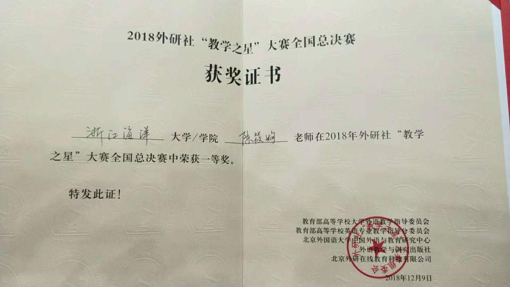 外研社“教学之星”大赛由教育部高等学校大学外语教学指导委员会、教育部高等学校英语专业教学指导委员会、北京外国语大学中国外语与教育研究中心、外语教学与研究出版社及北京外研在线教育科技有限公司共同举办。大赛每年有多达7000多名全国高等院校外语教师参加比赛,是全国外语类覆盖面广、形式新颖的高水平权威赛事。陈筱姁老师历经了2018年5月启动以来浙江省初赛、复赛和全国总决赛三个阶段,经历了从炎炎夏日到寒冬腊月,也经历了教师现场说课、讲课、专家提问等,在网络直播、线上线下严格评审下,最终脱颖而出。在备赛过程中,院系领导、同事们和她一起协同作战,精心打磨课程,奉献集体智慧。陈筱姁老师感言:“有幸与全国优秀的英语教师同台竞技,共研教学,实现以赛促学,以学促思。筹备比赛的过程也是一个不断完善自我,反思教学的过程。真正明白了学生语言能力的促成才是外语教师的立身之本,是深化教学内容的前提。辛苦备赛的7个月,辗转反侧的不眠夜,几经修改的课件,几番调整的排练,最终汇成了一句话,‘教学之星’的大舞台,I came, I challenged, I survived!You will be the next one!”