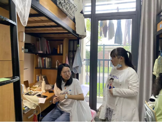 辅导员王逸菲进入各寝室走访,与刚返校的同学们亲切交谈,了解学生们的情况与需求。