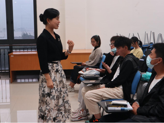 在互动环节中,为了让大家对职场礼仪有一个更直观、更清晰的认知,龚教授邀请各位学生对站姿礼仪、坐姿礼仪、呈递礼仪、沟通礼仪等方面进行实战演练,通过优劣对比的方式对礼仪细节进行阐释。