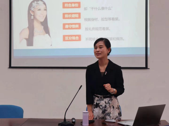 龚教授举止优雅大方,说话方式幽默风趣,通过举例生活中自己所经历的各类小故事,让在座对职场礼仪有了更加深刻的理解。龚教授的讲座讲述了礼仪概况、职场形象的重要性以及职场形象的塑造,环环相扣,层层推进。
