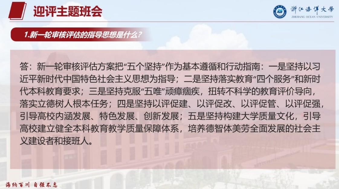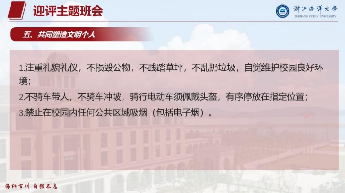 Y23教育(学科英语)班级在公共教学楼226室举行了以“迎审核评估,创优良风貌”为主题的班会活动。此次班会旨在积极响应学校即将于11月6日至9日进行的本科教育教学审核评估工作,虽然此次评估是针对于本科,但这是对我校教育教学水平、人才培养质量、整体办学实力的一次全面检验,也是对教风、学风、校风建设的一次整体考察,每一名海大学子,都应该积极行动,从我做起,为学校迎评促建工作贡献智慧和力量。